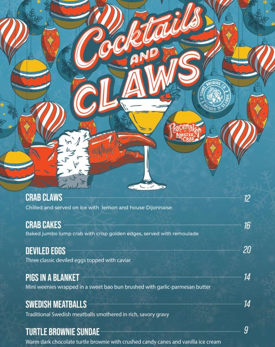 Guests can choose from a shareable menu of crab claws, crab cakes, deviled eggs, pigs in a blanket, Swedish meatballs and a turtle brownie sundae for dessert. Peacemaker’s regular menu is also available.