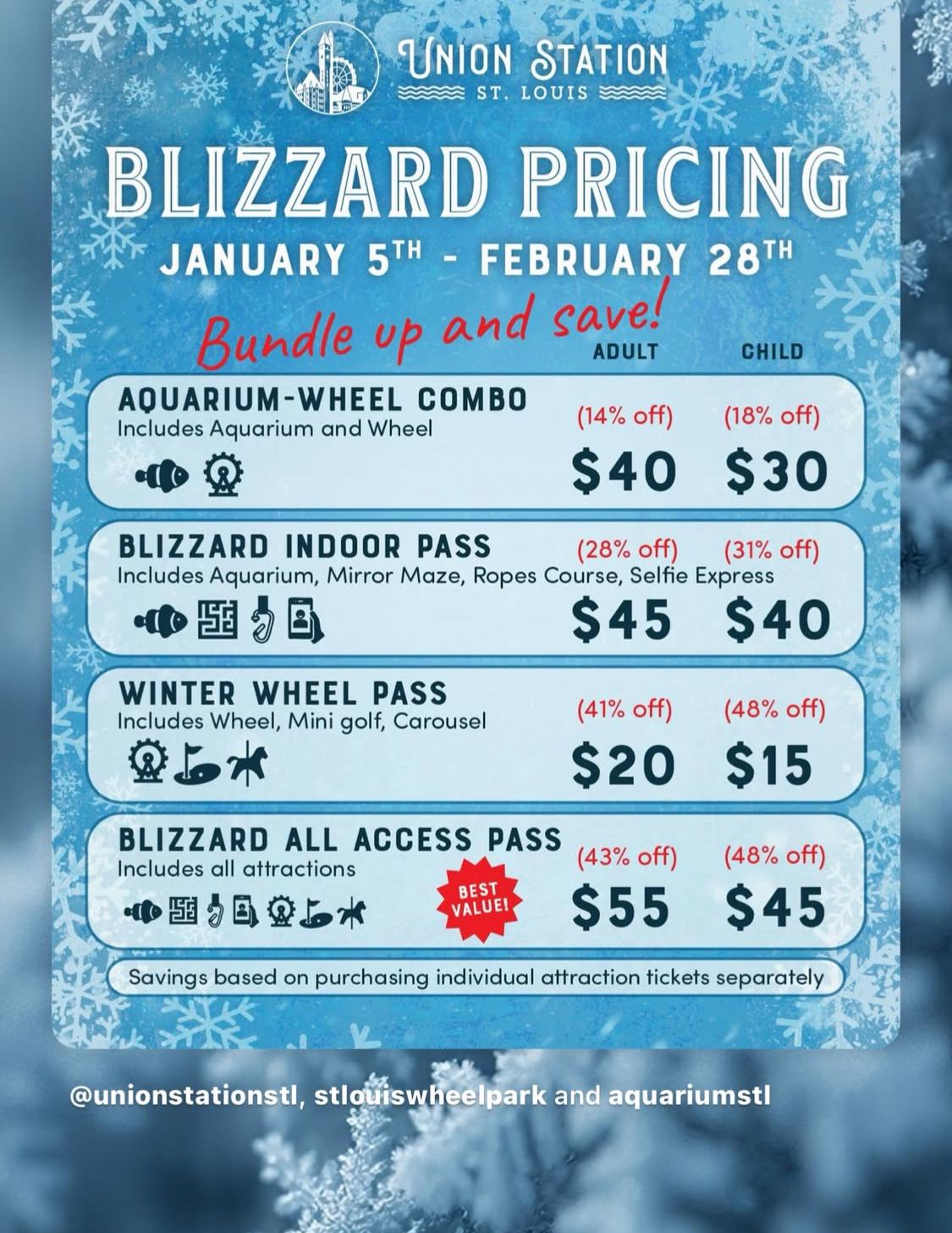 In both January and February, new Blizzard Pricing is in effect for combo tickets that pair the Aquarium with the other attractions at St. Louis Union Station. Savings of up to 43 percent are valid on admission tickets that combine all the fun at the family entertainment destination.