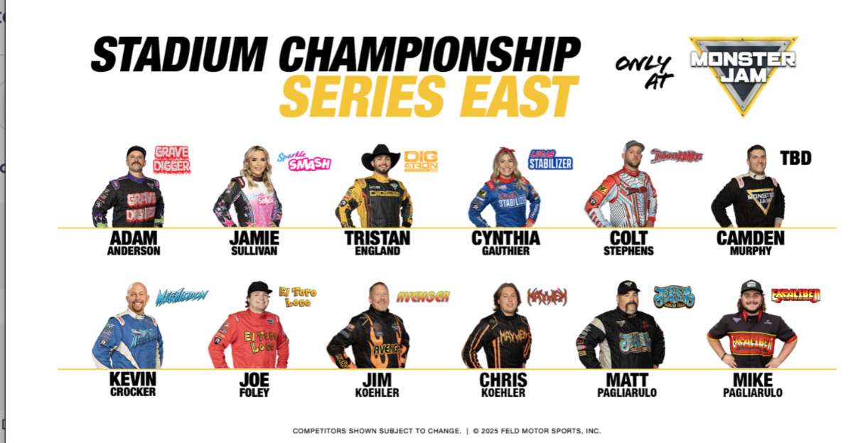Grave Digger® driven by Adam Anderson; Sparkle Smash® driven by Jamie Sullivan; JCB DIGatron® driven by Tristan England; Lucas Stabilizer® driven by Cynthia Gauthier; ThunderROARus® driven by Colt Stephens; TBD driven by Camden Murphy; Megalodon® driven by Kevin Crocker; El Toro Loco® driven by Joe Foley; Avenger driven by Jim Koehler; Mayhem driven by Chris Koehler; Jester driven by Matt Pagliarulo; and Excaliber driven by Mike Pagliarulo