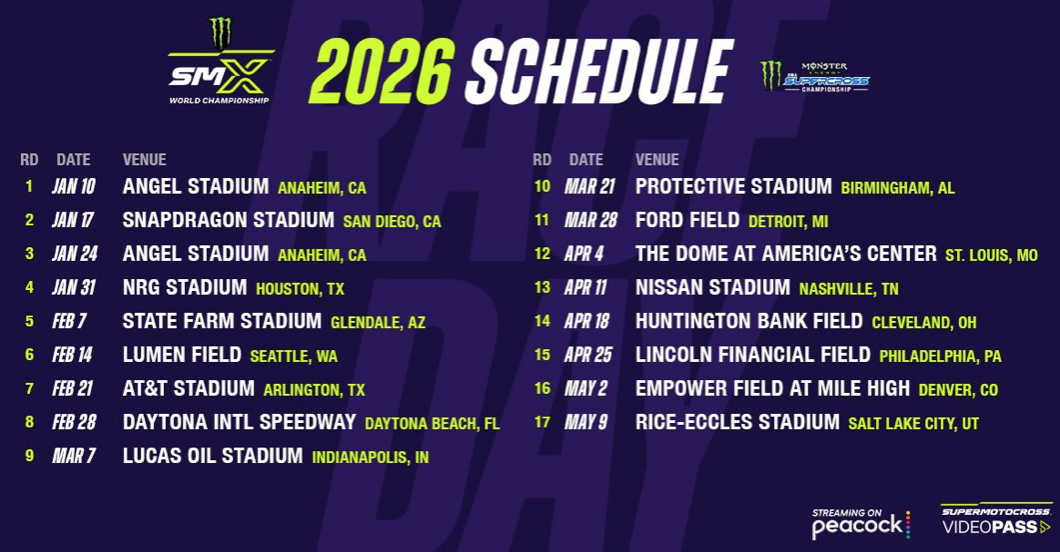 ST. LOUIS, MO (October, 2025) – The SMX LeagueTM announced today the full 2026 Monster Energy SMX World Championship regular season schedule and tickets on sale for all 17 rounds of the 2026 Monster Energy AMA Supercross Championship. The world’s best two-wheel racers converge on The Dome at America’s Center on Saturday, April 4, 2026.