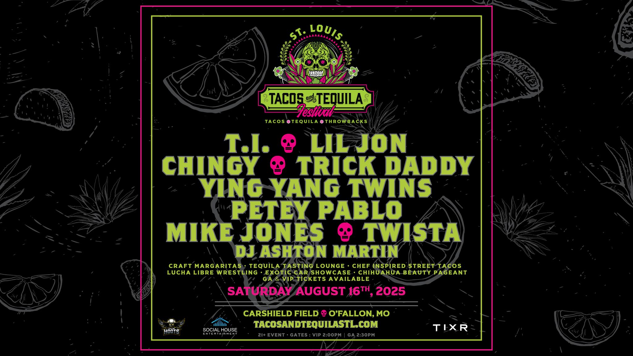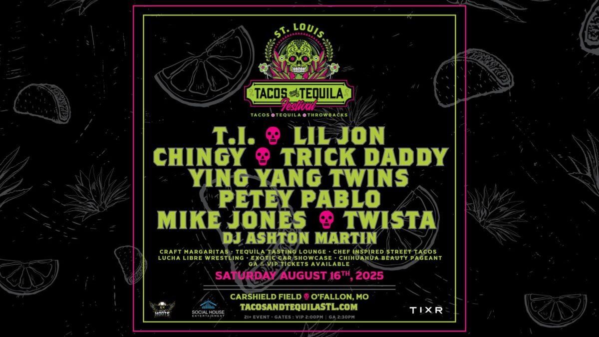 Tacos and Tequila Festival is coming to St. Louis, MO at CarShield Field on August 16th, 2025! DON’T MISS these hip hop legends… Enjoy food from the area’s best taco chefs, a queso & salsa competition, lucha libre wrestling, and our famous Chihuahua Beauty Pageant. Plus, fully stocked bars and more surprises!