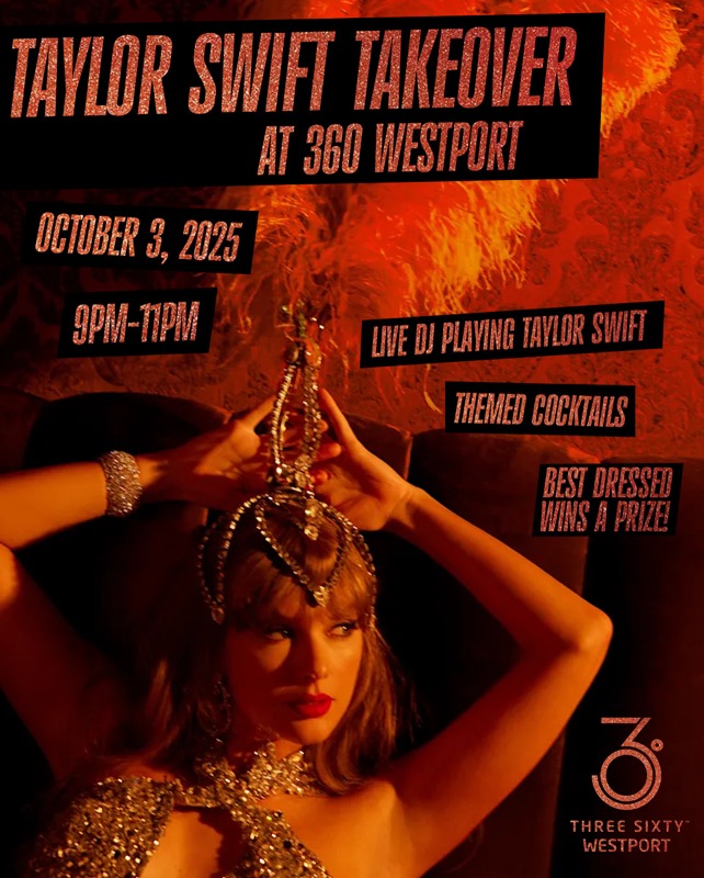 Take your love of Taylor into the night at 360 Westport at Westport Plaza. During the Taylor Swift takeover, a DJ will spin new tunes from Life of a Showgirl along with Taylor’s classics. Wear your best Swift-inspired garb and compete for prizes in the costume contest. The party runs from 9 to 11 p.m. on Friday, October 3. Tasty themed cocktails will be available. Admission is 21+. Cover: $10.